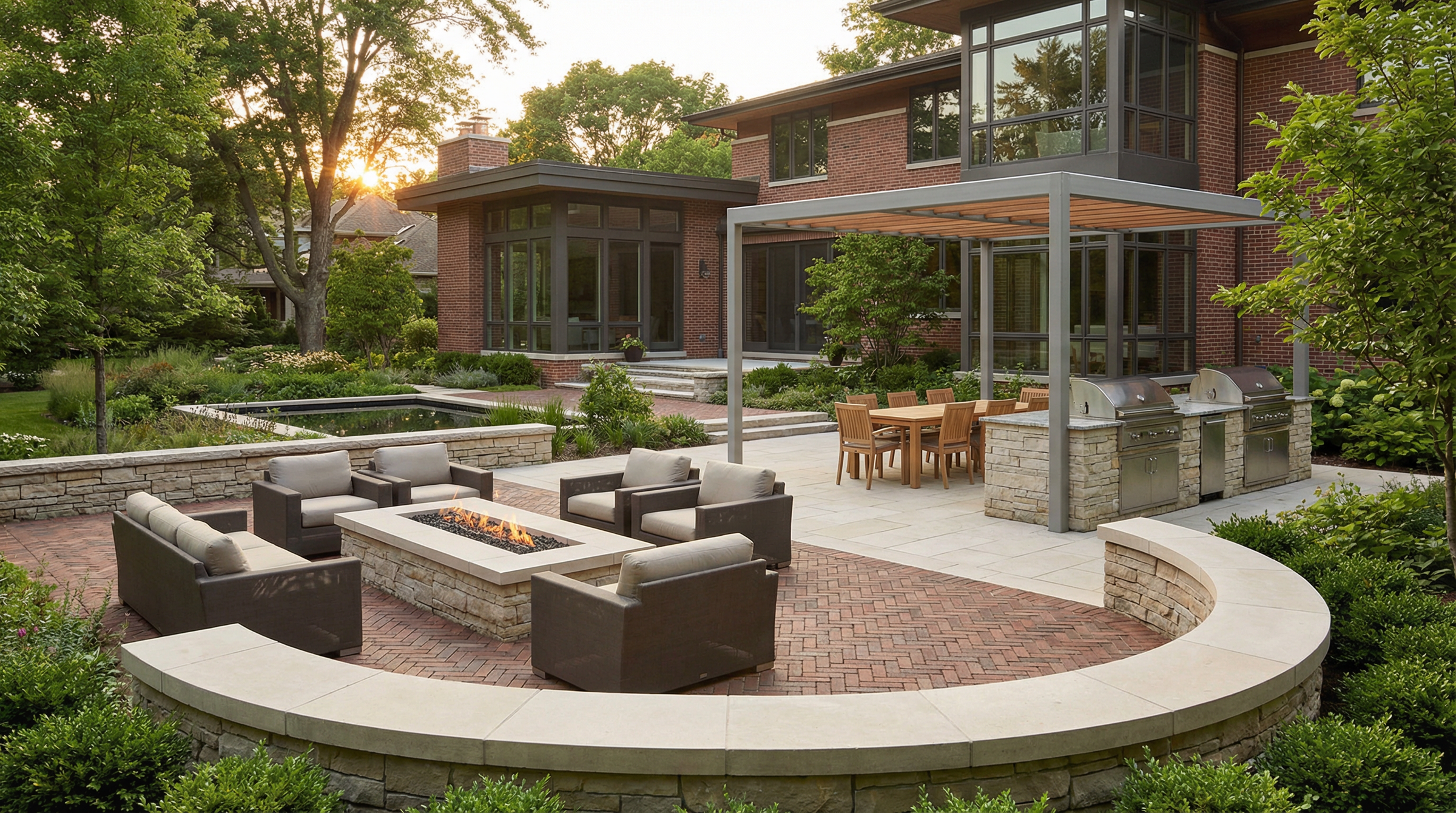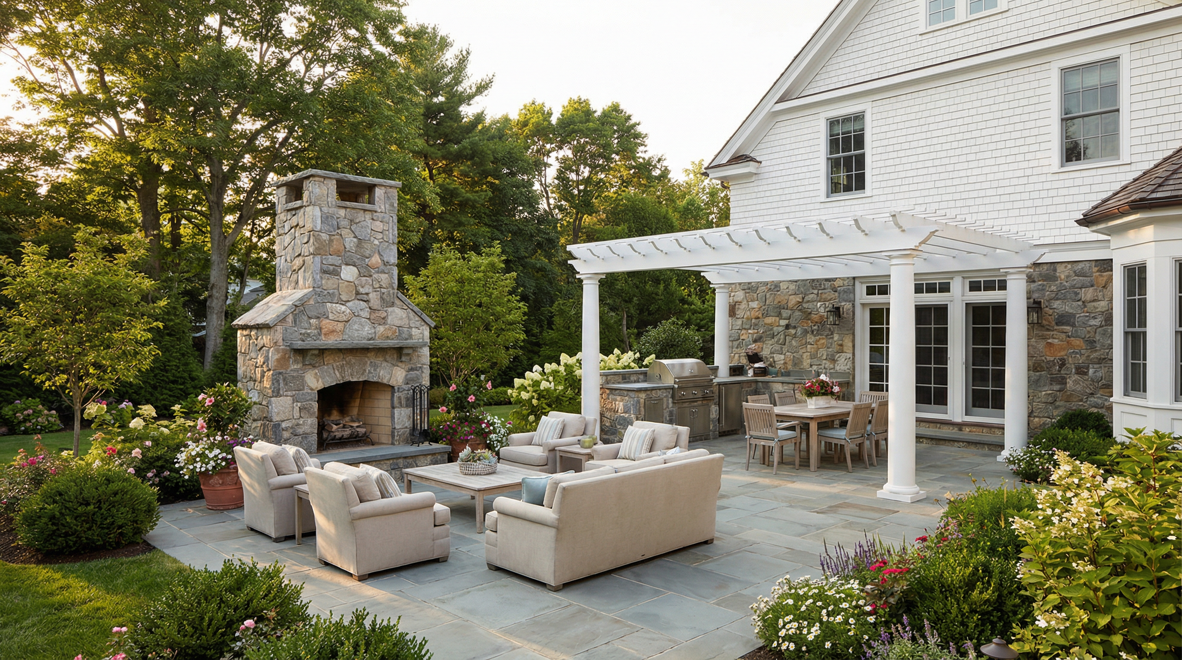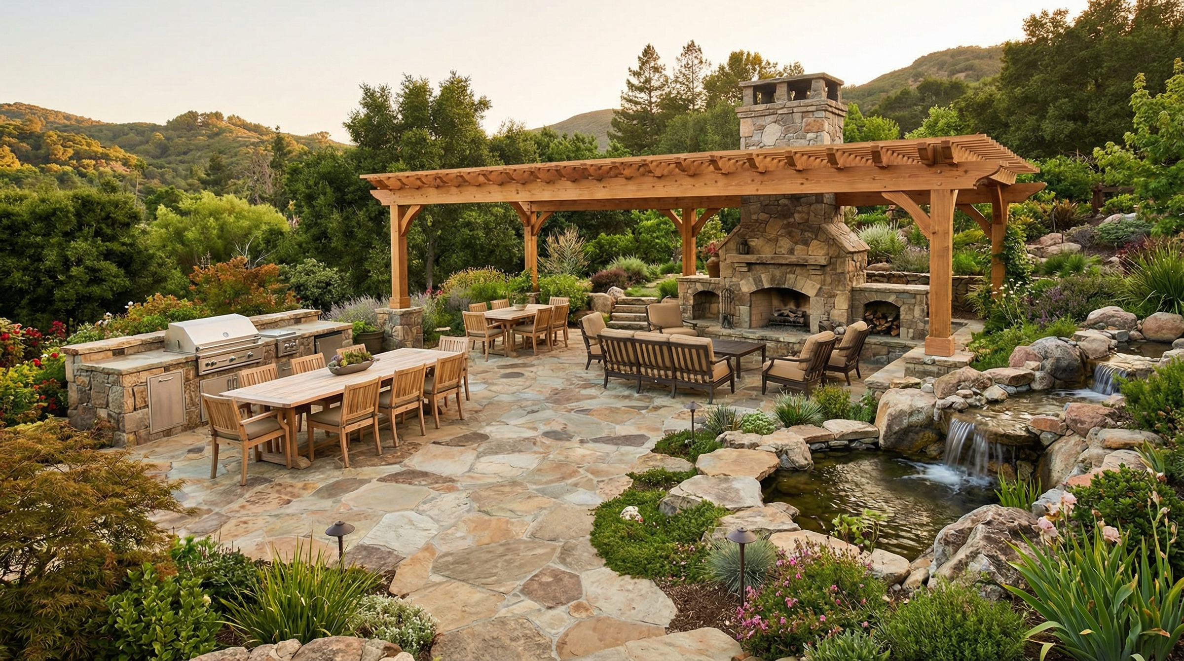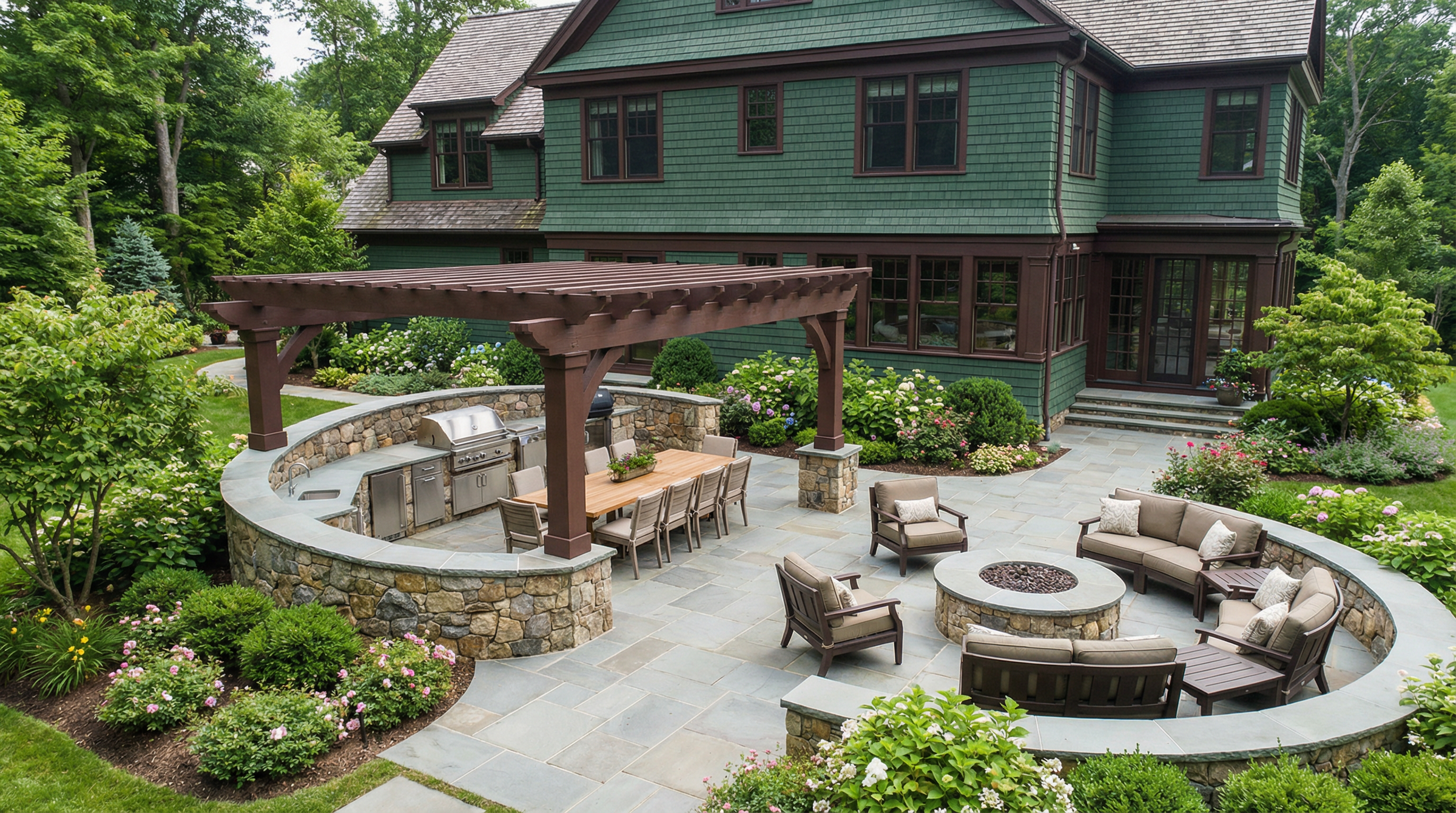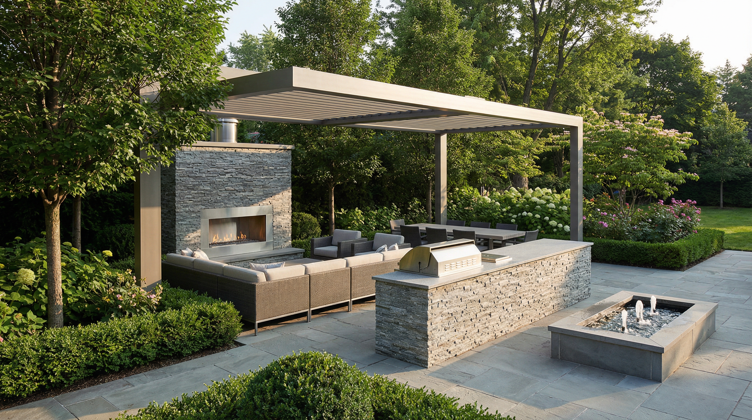 Whether conceived as a seamless transition from the house or as a destination sanctuary in your landscape gardens, each element—stonework, structures, furnishings, planting, and lighting—is carefully considered so the entire space reads as a cohesive composition.