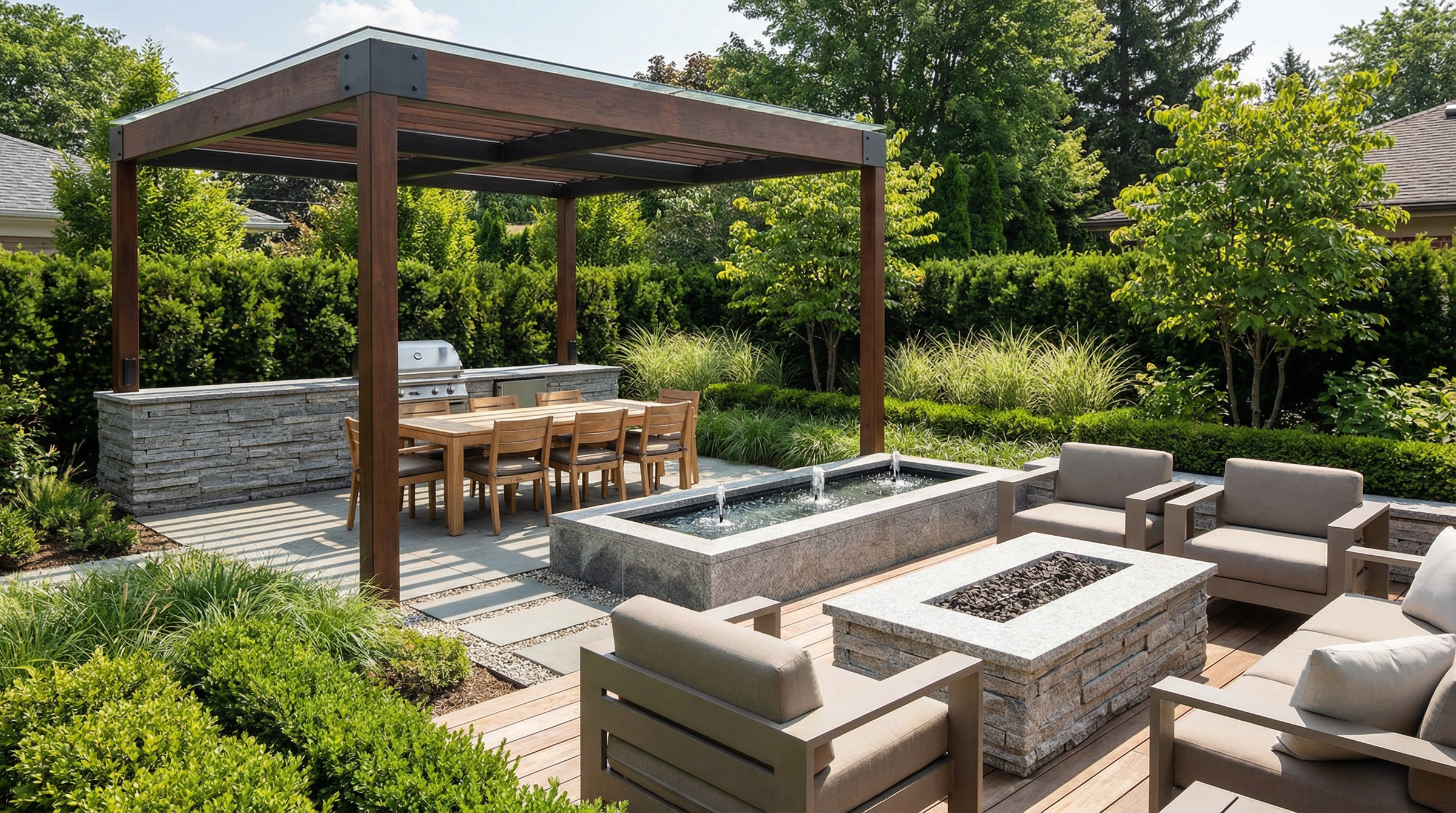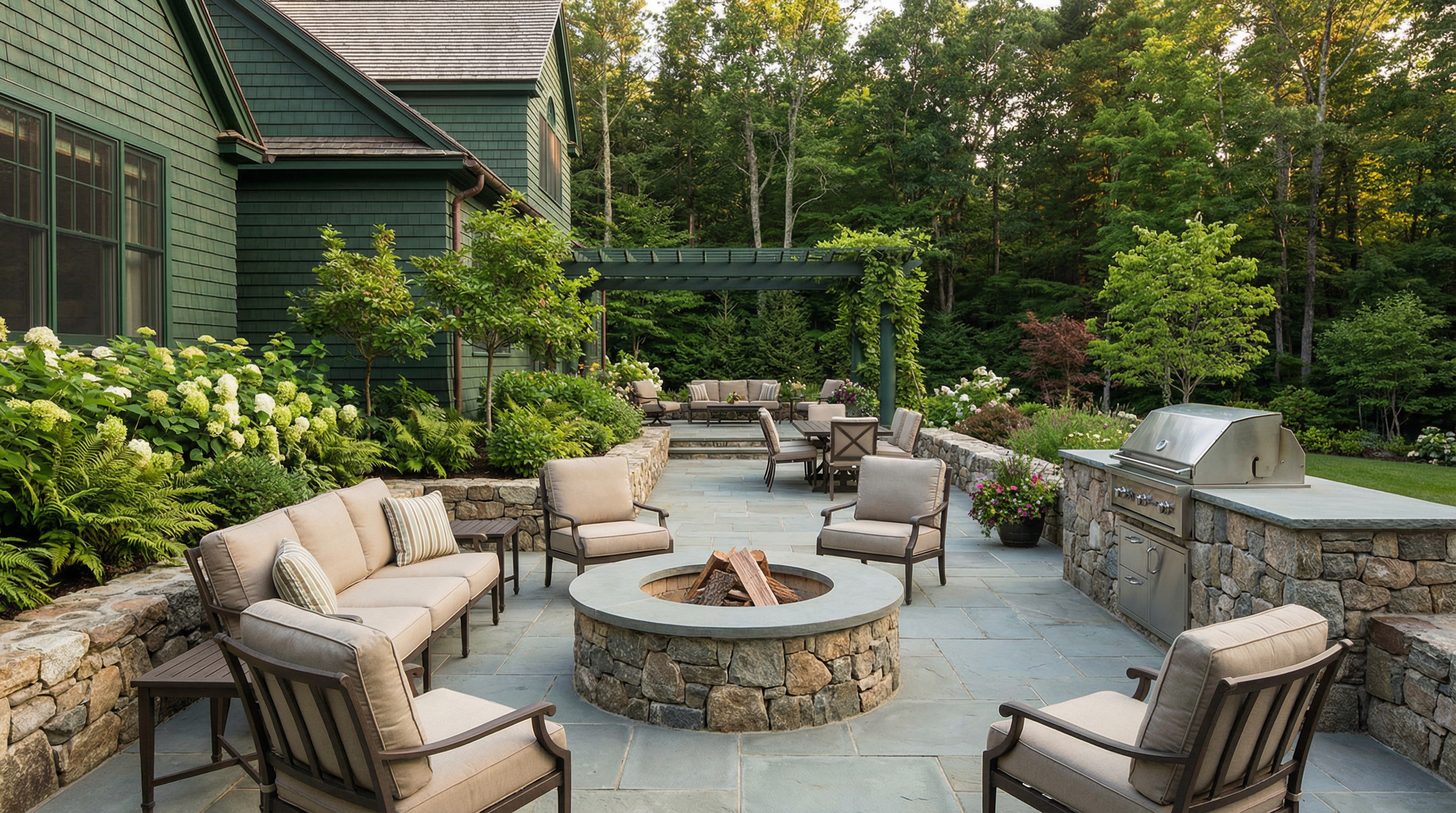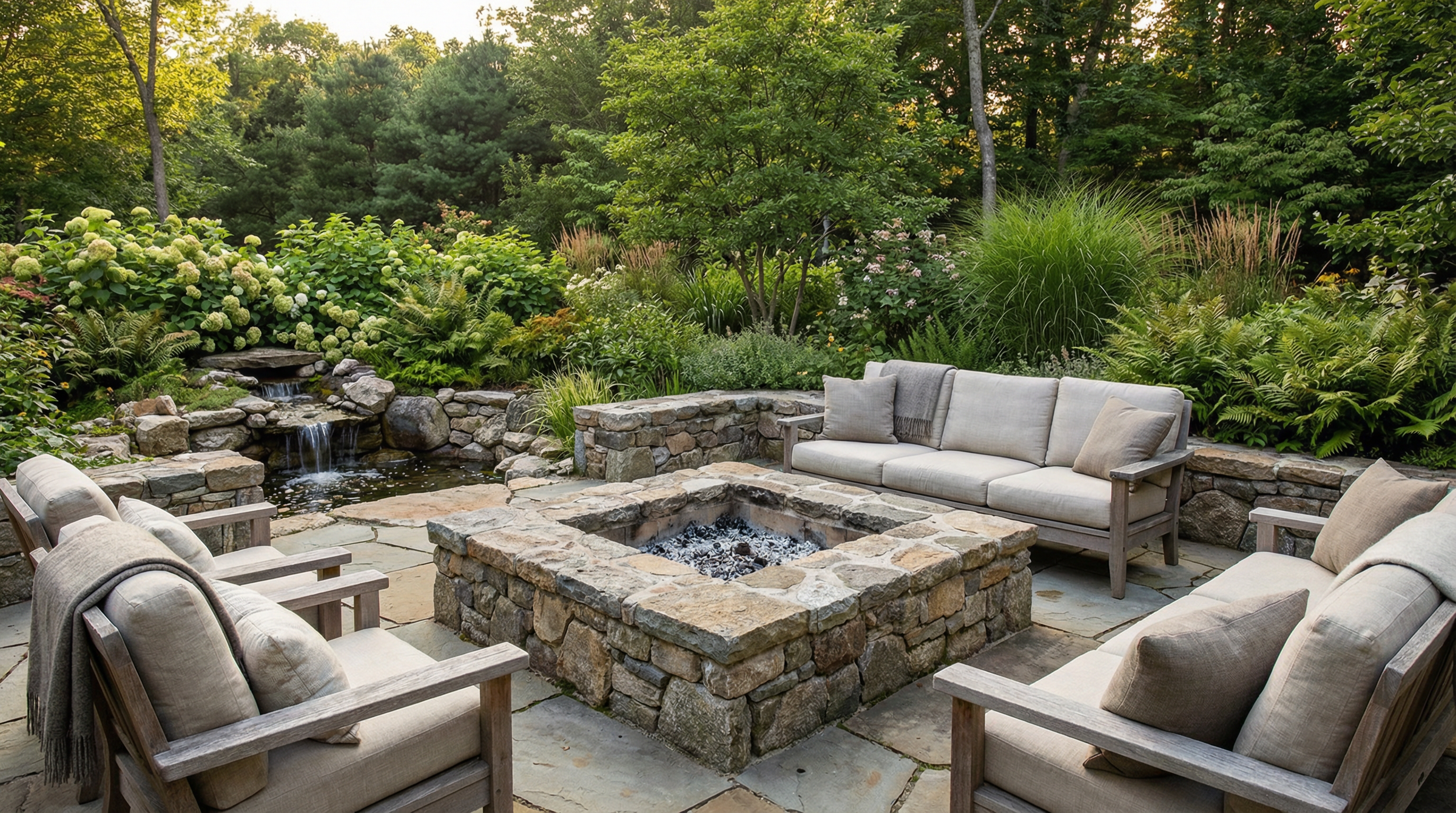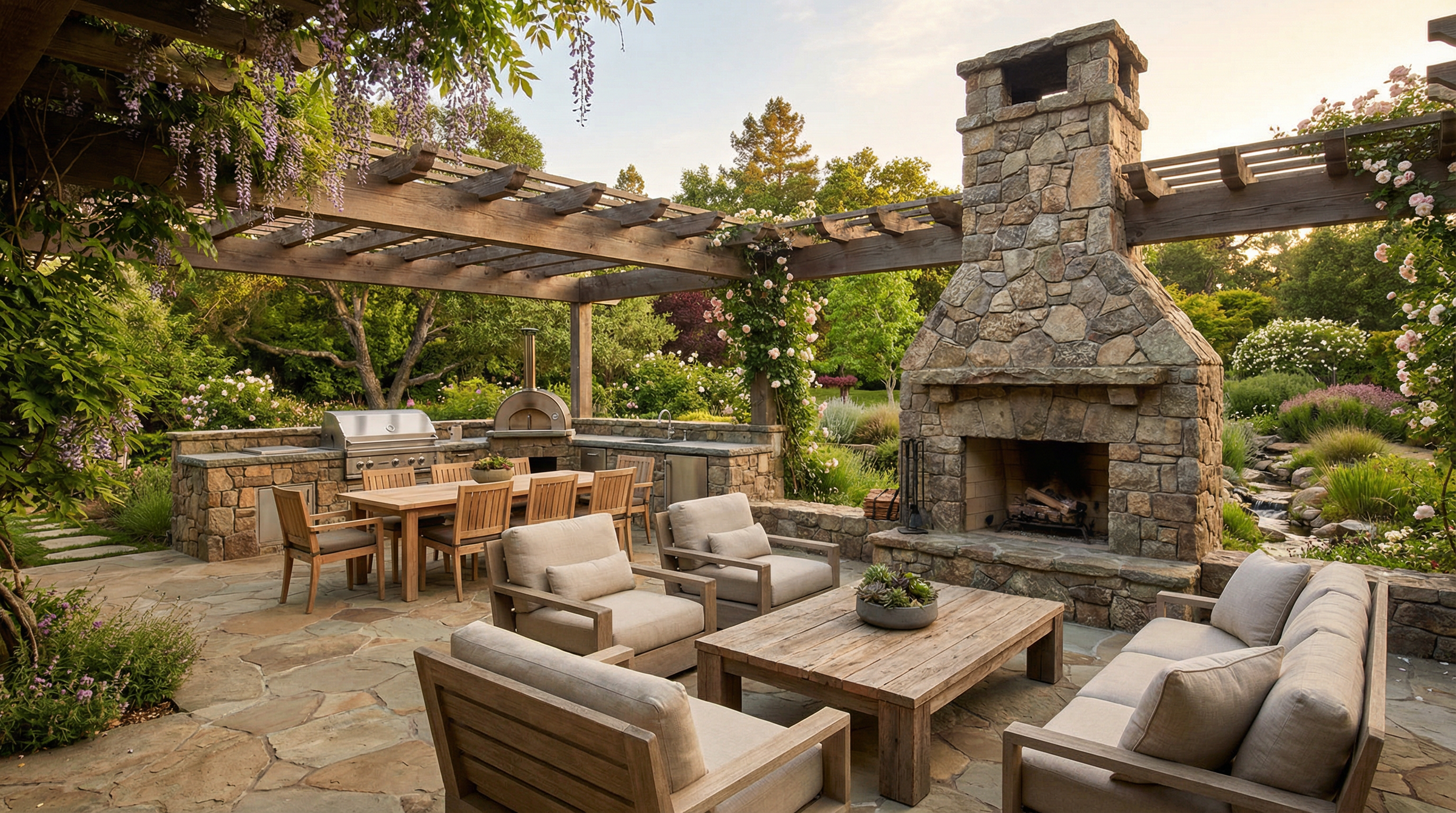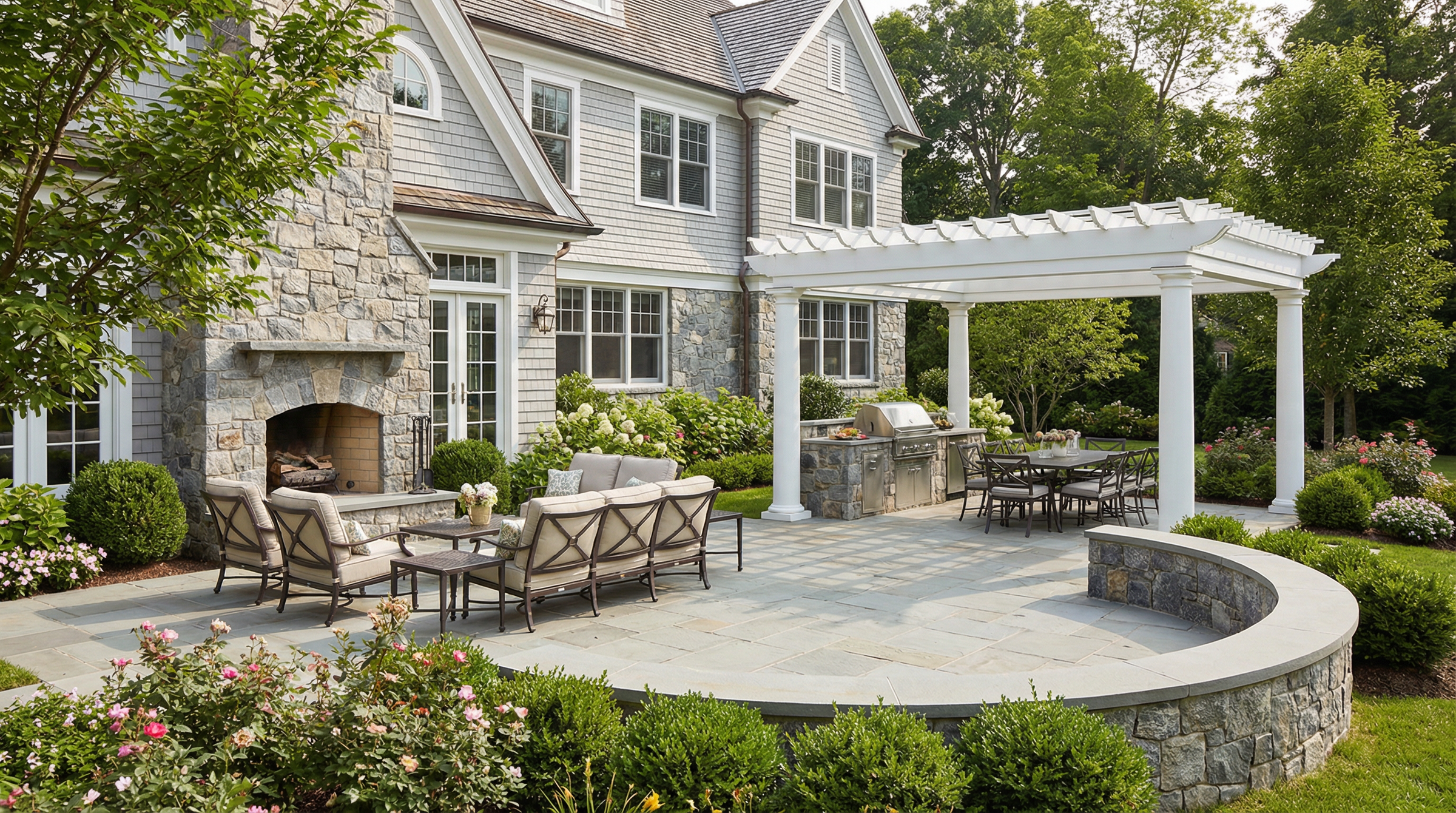 Whether conceived as a seamless transition from the house or as a destination sanctuary in your landscape gardens, each element—stonework, structures, furnishings, planting, and lighting—is carefully considered so the entire space reads as a cohesive composition.
