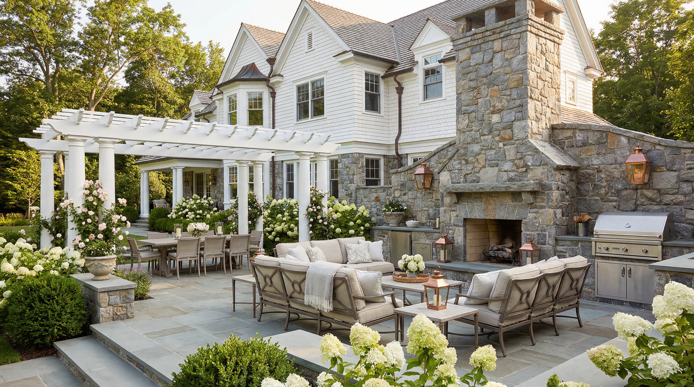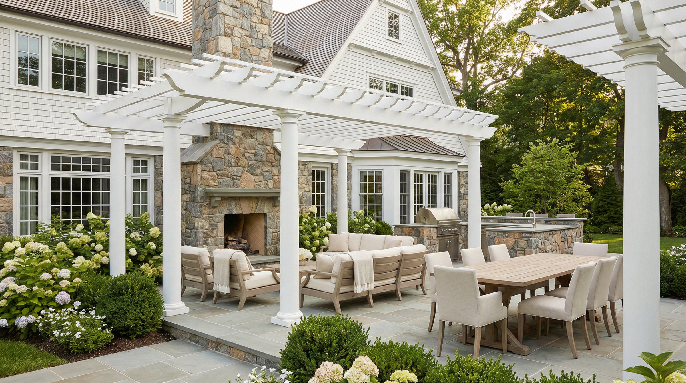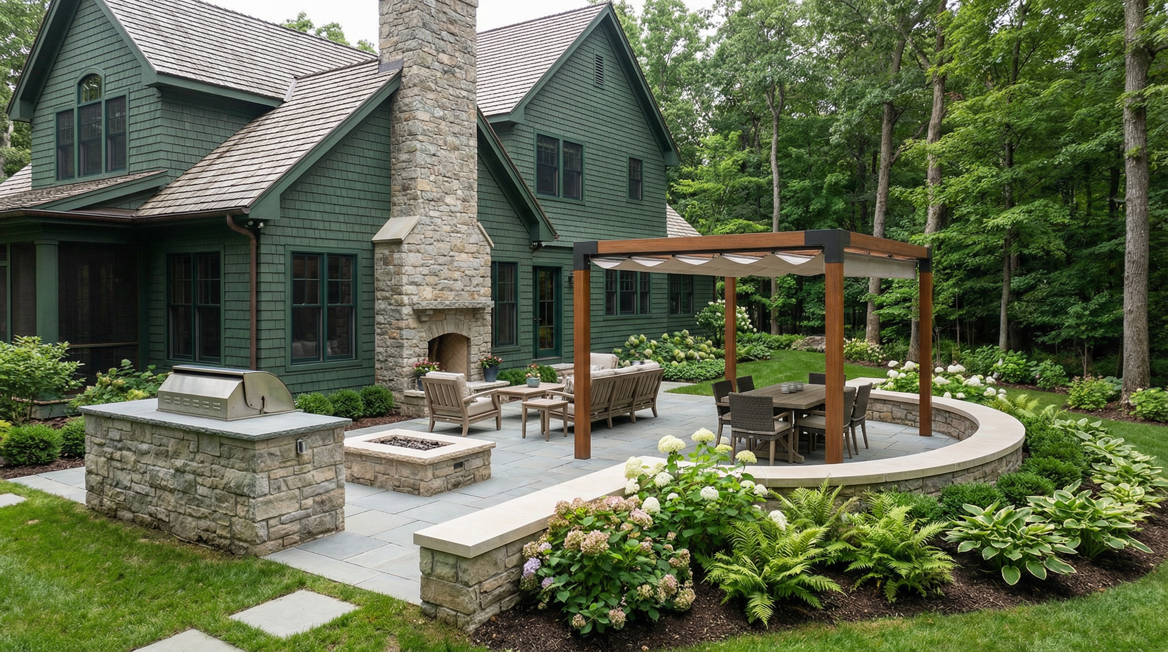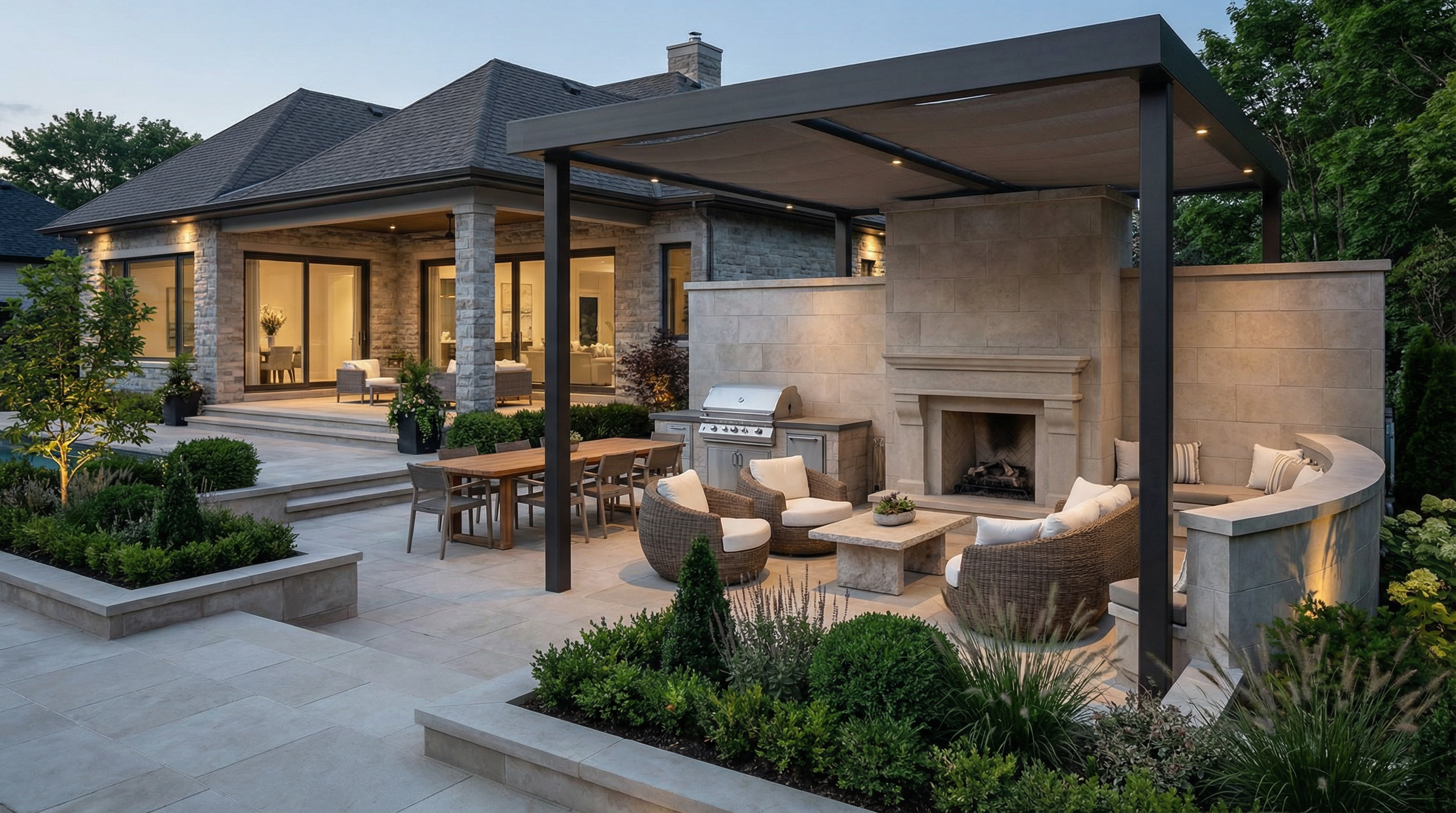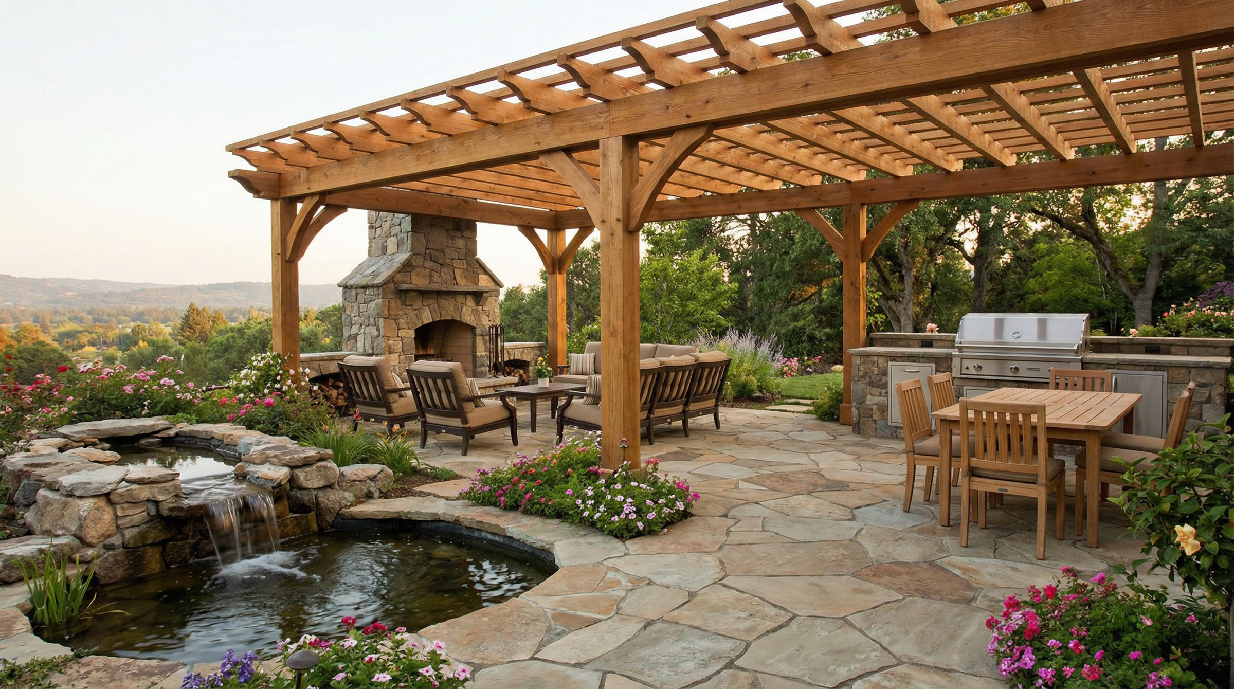 Whether conceived as a seamless transition from the house or as a destination sanctuary in your landscape gardens, each element—stonework, structures, furnishings, planting, and lighting—is carefully considered so the entire space reads as a cohesive composition.