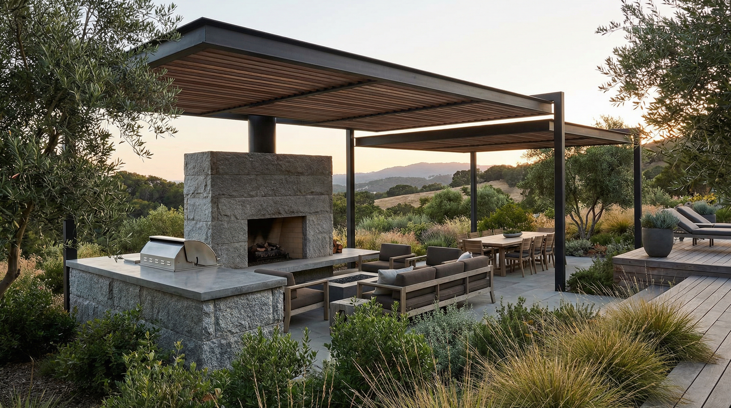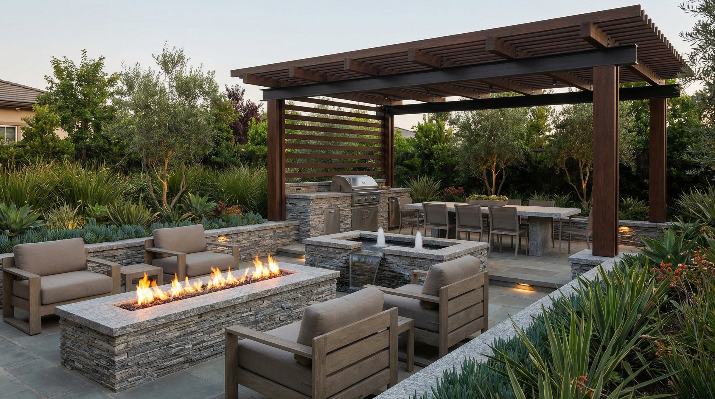 • Layered planting design around outdoor living areas